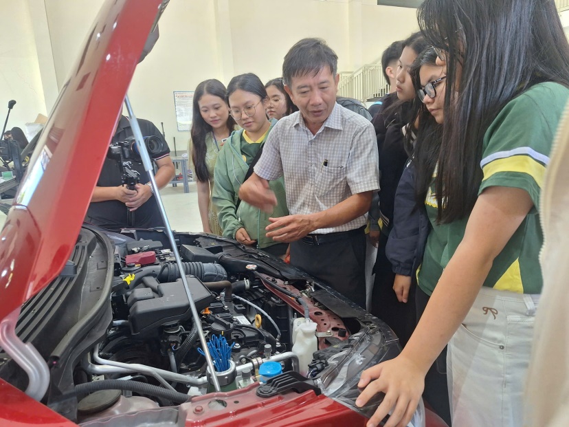 Tiếng máy nổ giòn giã sau đó đã dẫn lối chúng em đến với Xưởng Ô tô. Giữa mùi dầu máy nồng nàn và tiếng kim loại va chạm đầy uy lực, những chiếc xe không còn là phương tiện vô tri. Chúng là hiện thân của kỷ luật và sự tận hiến. Mỗi khối động cơ được tháo rời là một bài học về sự bền bỉ: Để một cỗ máy vận hành êm ái, mọi chi tiết nhỏ nhất đều phải đạt đến độ hoàn thiện tối đa.