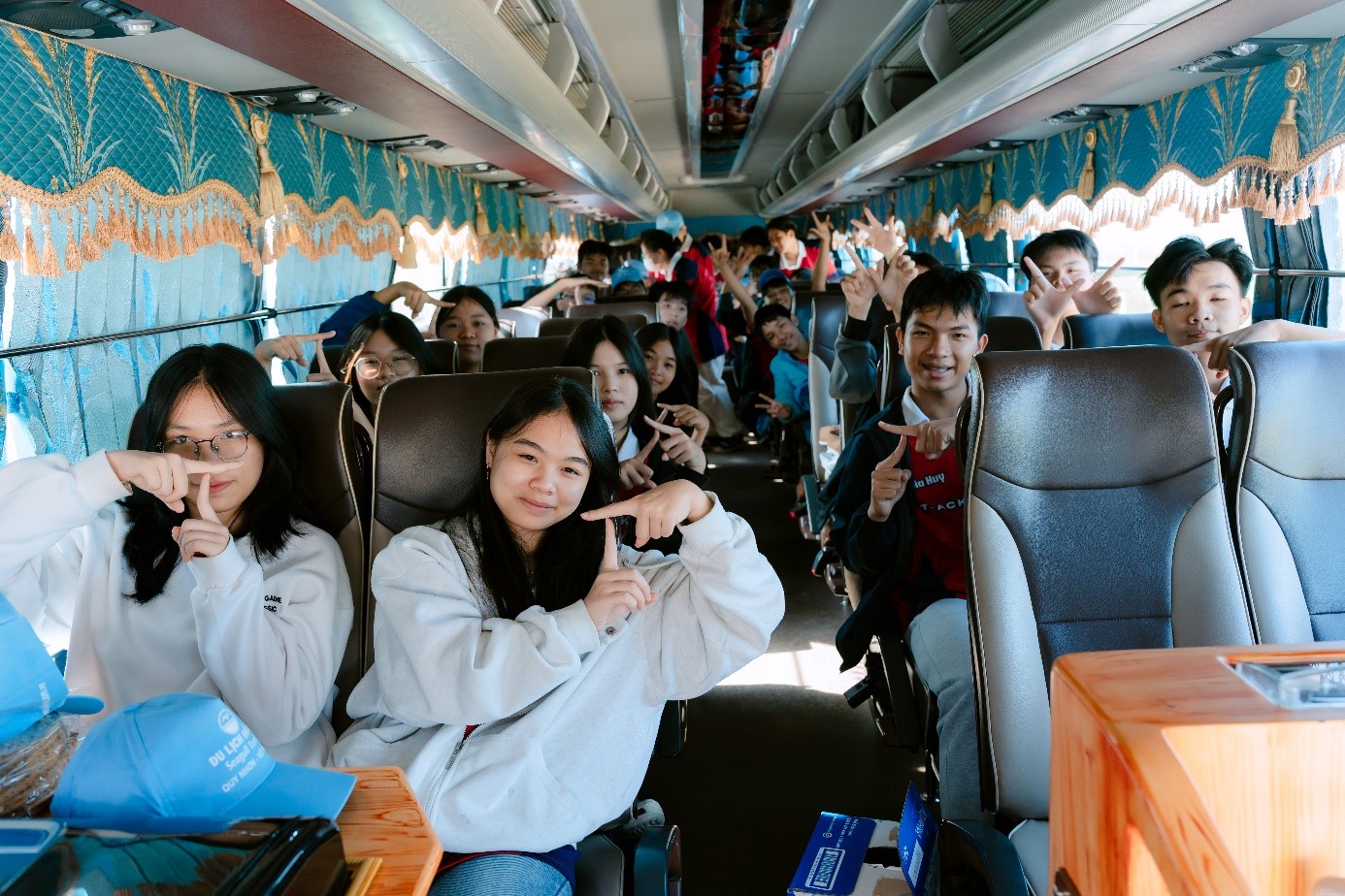 Chiếc xe lăn bánh mang theo tiếng cười râm ran, những câu chuyện đứt quãng và ánh mắt không giấu nổi niềm háo hức của tuổi học trò trước một ngày mới lạ. Qua ô cửa kính, hàng cây, mái nhà, con đường quen thuộc dần lùi về phía sau, hiện lên vừa gần gũi vừa mới mẻ. Trong khoảnh khắc ấy, chúng em không chỉ đang di chuyển đến một điểm đến cụ thể, mà còn đang bước ra khỏi vùng an toàn của chính mình, để mở lòng đón nhận những giá trị mộc mạc, chân thành của quê hương bằng sự trong trẻo, sôi nổi và đầy sắc màu của tuổi trẻ.