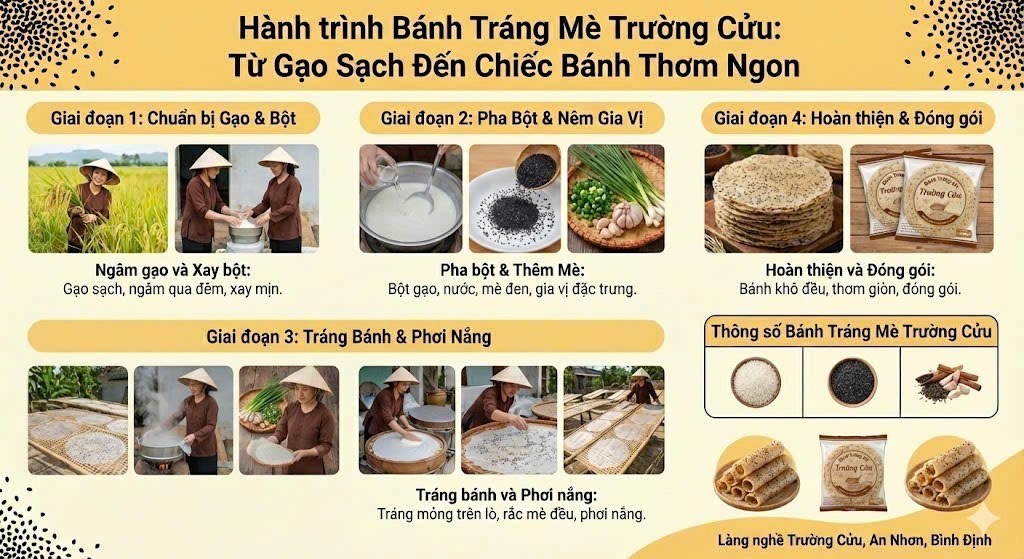 Chi tiết quá trình làm ra bánh tráng mè Trường Cửu thơm ngon.
