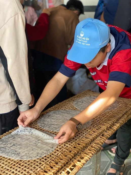 Điểm dừng chân đầu tiên của chuyến đi là làng nghề bánh tráng Trường Cửu. Trên đường di chuyển, anh hướng dẫn viên đã giới thiệu sơ lược về làng nghề với bề dày lịch sử hàng trăm năm, nổi tiếng bởi những chiếc bánh tráng dẻo thơm, mang hương vị rất riêng của vùng đất An Nhơn. Khi đặt chân đến làng, chúng em được người dân nơi đây đón tiếp bằng sự thân thiện, gần gũi và nhiệt tình. Các cô, các chú tận tình giới thiệu quy trình làm bánh tráng truyền thống – từ khâu trồng lúa, xay gạo, trộn bột cho đến tráng bánh – cùng những câu chuyện về khó khăn, thử thách trong việc gìn giữ và phát triển làng nghề qua năm tháng.