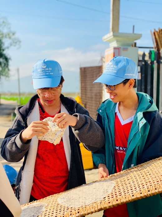 Chúng em còn được trực tiếp tham quan nhà của một nghệ nhân làm bánh tráng lâu năm. Bà với đôi bàn tay thoăn thoắt, khéo léo đã khiến cả lớp không khỏi trầm trồ khi chứng kiến từng chiếc bánh tráng mỏng tang được tạo nên nhanh chóng và điêu luyện, chẳng khác nào một nghệ sĩ thực thụ. Đặc biệt, khi tự tay tráng bánh, chúng em mới cảm nhận trọn vẹn sự công phu, tỉ mỉ của công việc tưởng chừng giản đơn ấy – một trải nghiệm hoàn toàn khác biệt so với những kiến thức chỉ được học qua sách vở. Trước khi rời làng, chúng em còn mua một ít bánh tráng làm quà, như mang theo hương vị quê hương và những kỷ niệm đẹp của chuyến đi.