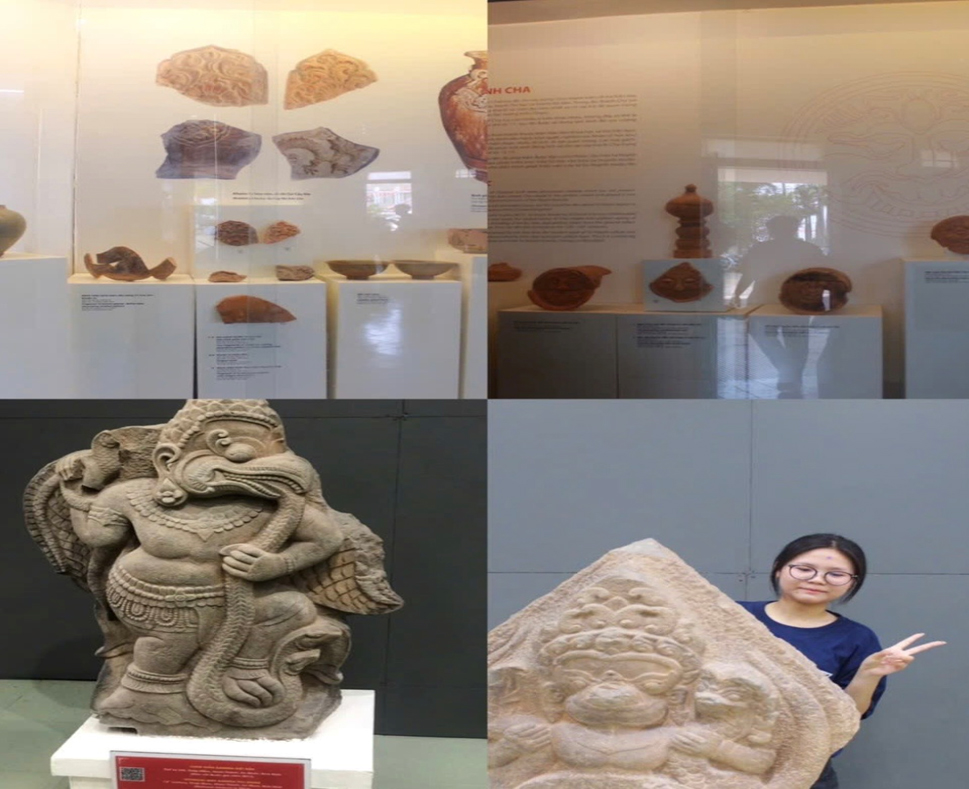 Nếu phòng đầu tiên là đời sống, thì phòng “văn hóa Chăm” lại là chiều sâu. Không gian ấy như tách biệt khỏi nhịp hiện tại, mang theo một vẻ trầm mặc rất riêng. Những tượng đá, phù điêu không chỉ là sản phẩm của kỹ thuật, mà là kết tinh của tư duy thẩm mỹ và tín ngưỡng. Ở đó, cái đẹp không phô bày mà ẩn chứa; càng nhìn, càng thấy nhiều lớp nghĩa. Chúng em có cảm giác như đang đứng trước một nền văn minh không mất đi, mà chỉ lùi vào phía sau thời gian, chờ được lắng nghe. Chính sự cổ kính ấy tạo nên một sức hút rất đặc biệt – không ồn ào, nhưng đủ khiến người ta phải suy ngẫm.