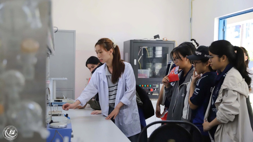 Không dừng lại ở lý thuyết, chúng em còn được giới thiệu về các nhóm ngành đào tạo của nhà trường, từ đó hiểu rõ hơn về môi trường học tập tại trường Đại học Quy Nhơn. Đặc biệt, phần tham quan thực tế đã để lại trong chúng em nhiều ấn tượng sâu sắc. Chúng em được ghé thăm các phòng thực hành hiện đại như phòng công nghệ nano, phòng phân tách vật liệu… với hệ thống máy móc vô cùng tiên tiến, có giá trị lên đến hàng trăm triệu, thậm chí hàng tỉ đồng. Điều đó khiến chúng em không khỏi choáng ngợp và trầm trồ trước điều kiện học tập và nghiên cứu tại trường. Tại mỗi phòng, chúng em còn được các anh chị tận tình giới thiệu về nguyên lý hoạt động, cách vận hành của thiết bị, thậm chí còn được “kiểm tra nhẹ” kiến thức, tạo nên không khí vừa thú vị vừa thử thách. Được trực tiếp quan sát, chạm tay và trải nghiệm đã giúp những kiến thức tưởng chừng khô khan trở nên sống động và gần gũi hơn bao giờ hết.