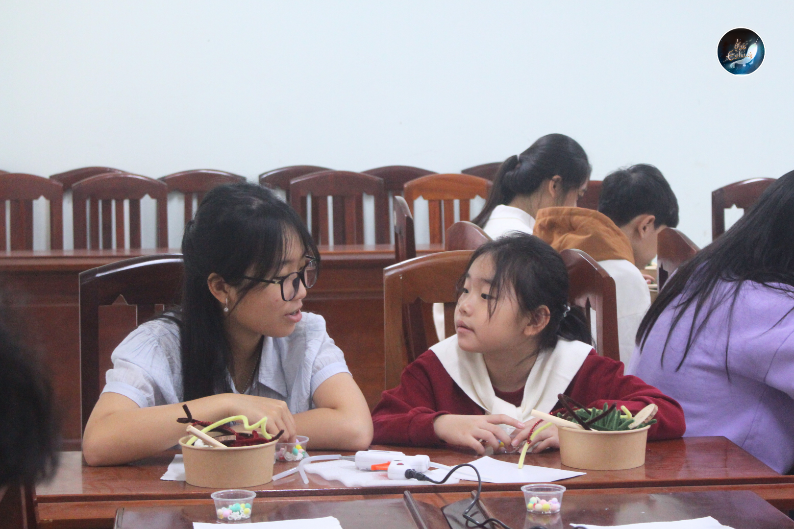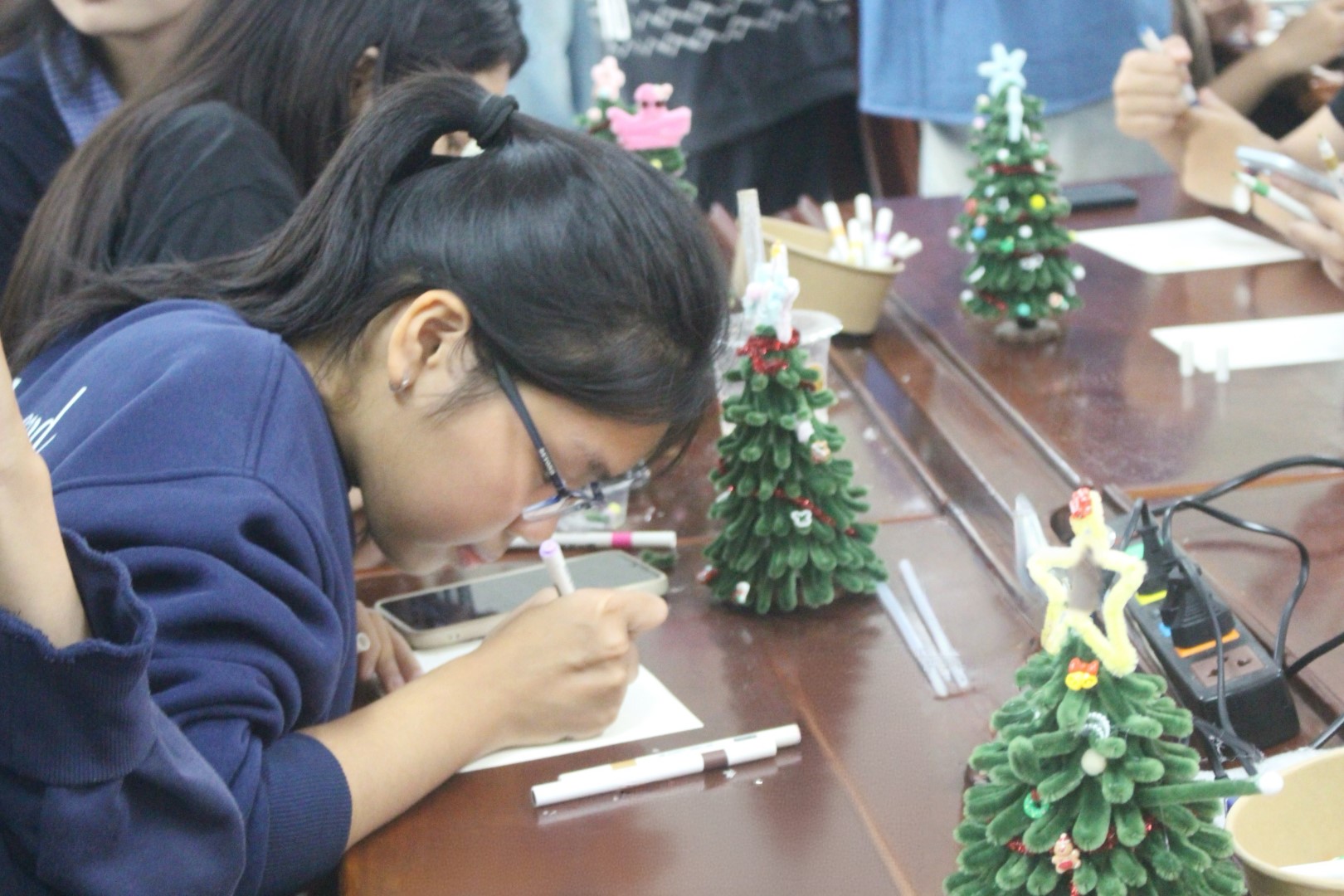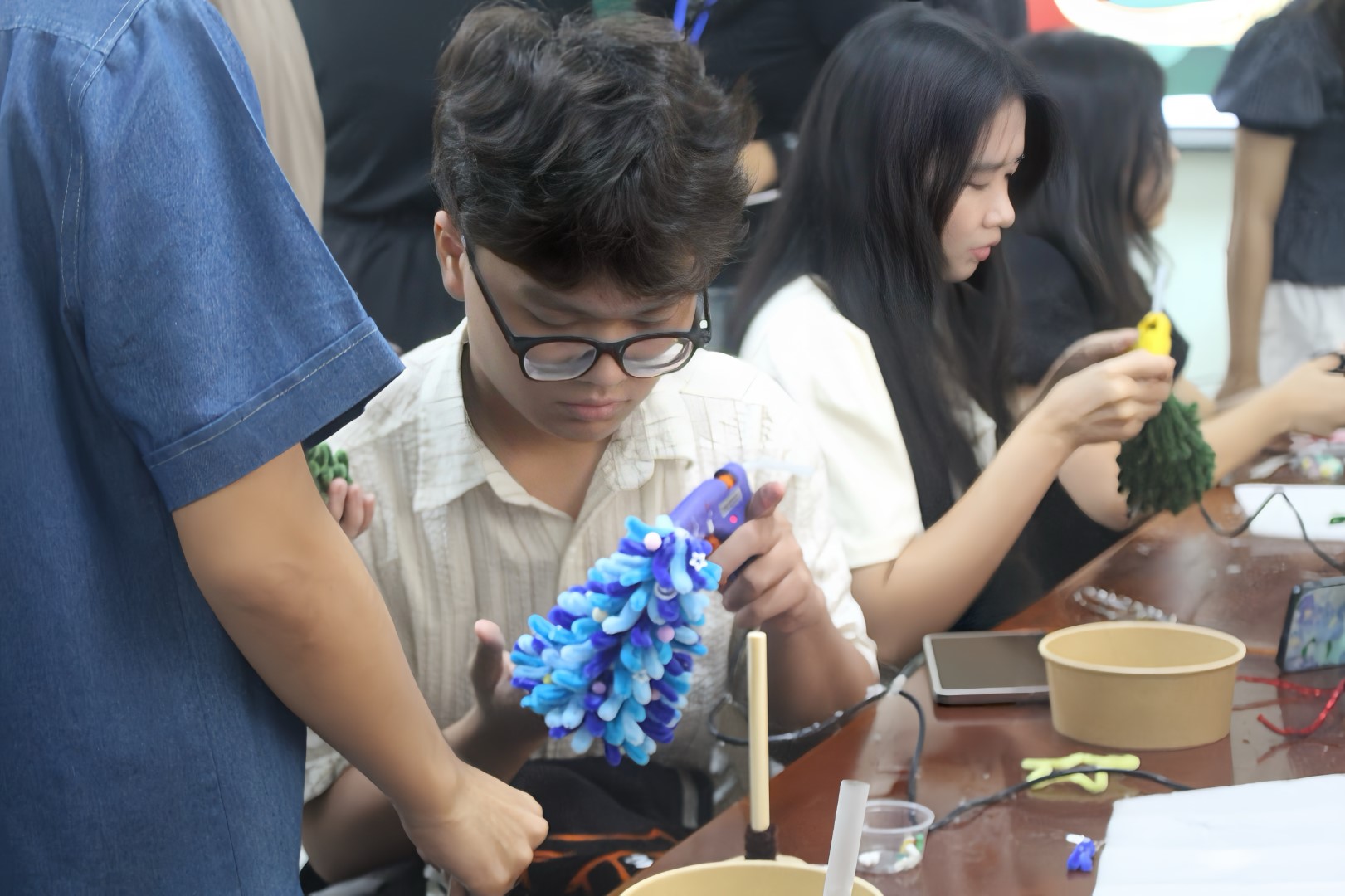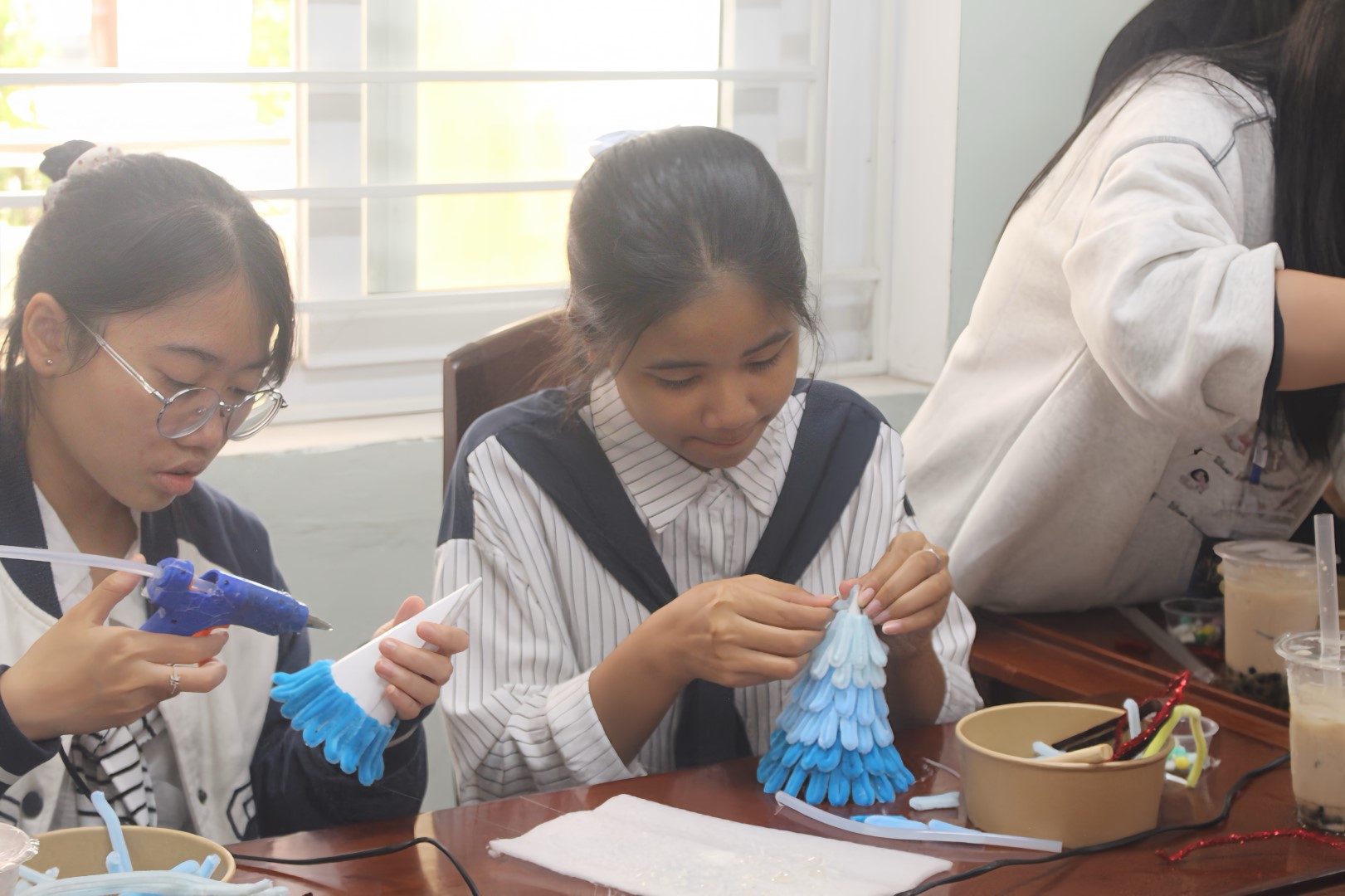 Sau những tiết mục âm nhạc mở màn, Workshop “Eternal Eve” tiếp tục với hoạt động trải nghiệm chính là làm cây thông Giáng sinh từ những sợi kẽm nhung nhiều màu sắc. Dưới sự hướng dẫn và hỗ trợ của các thành viên Câu lạc bộ, người tham gia được tự do sáng tạo, thiết kế cây thông theo sở thích và cá tính riêng. Từng chi tiết được uốn nắn cẩn thận, kết hợp linh hoạt về màu sắc và hình dáng, đã tạo nên những sản phẩm thủ công độc đáo, góp phần lan tỏa trọn vẹn không khí Giáng sinh ấm áp.