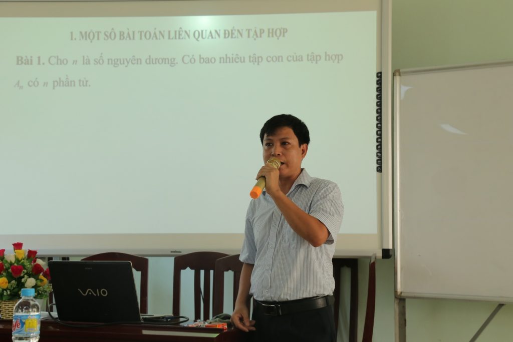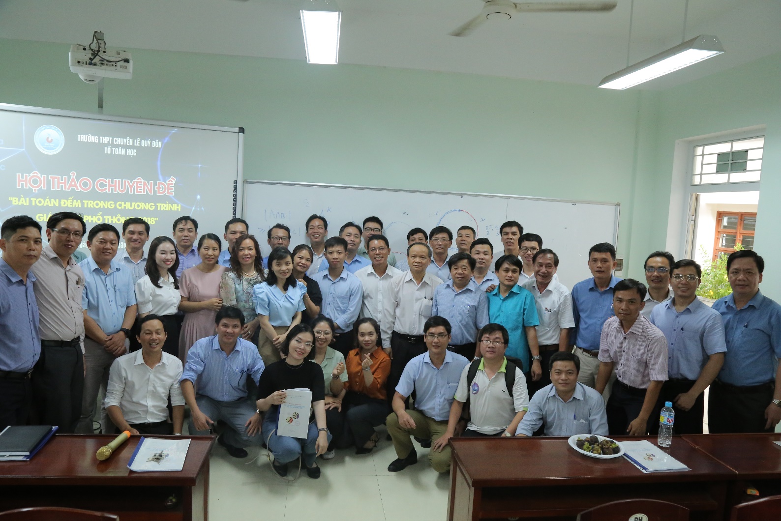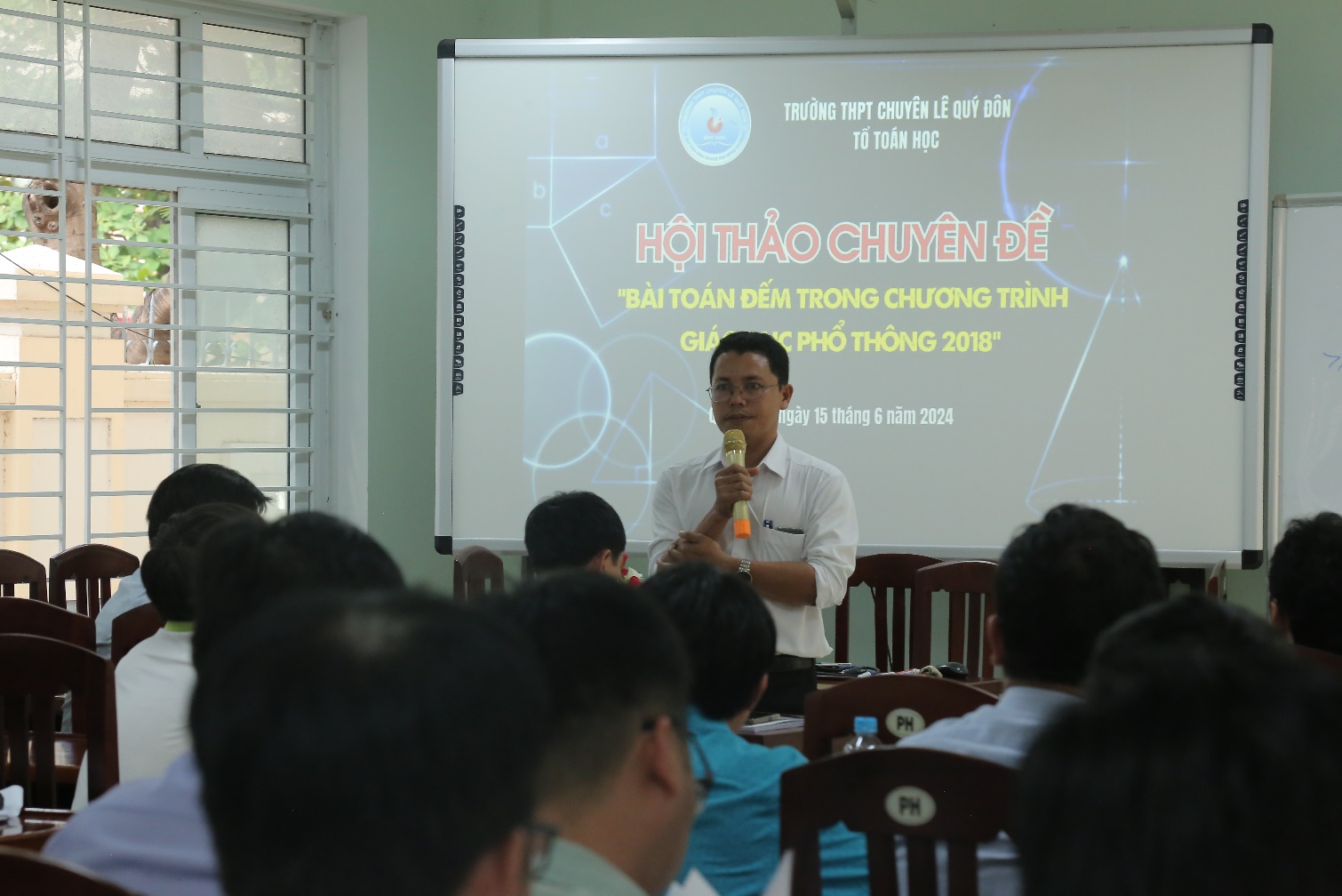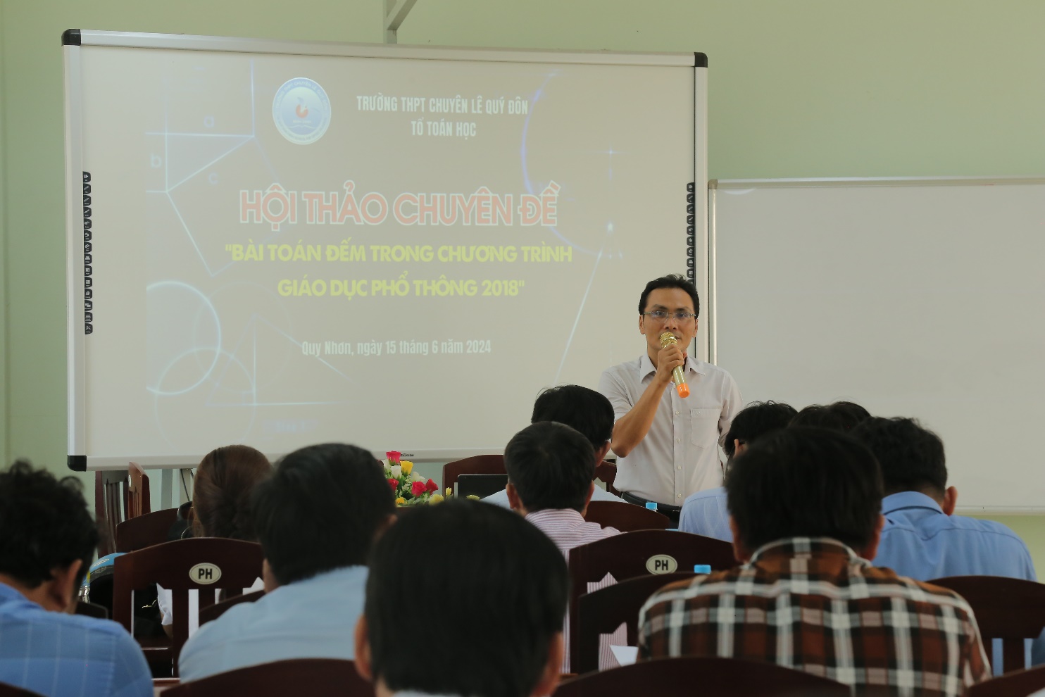 Nhằm mục đích kết nối và chia sẻ, Tổ Toán học – Trường THPT chuyên Lê Quý Đôn – thành phố Quy Nhơn – tỉnh Bình Định tổ chức hội thảo chuyên đề “Bài toán đếm trong chương trình giáo dục phổ thông 2018” nhằm giúp quý thầy giáo, cô giáo có điều kiện chia sẻ những kiến thức mới, trao đổi những khó khăn để thuận lợi hơn khi thực hiện nội dung kiến thức về Bài toán đếm trong công tác giảng dạy chương trình giáo dục phổ thông 2018. Đó chính là lí do của buổi hội thảo mà thầy Nguyễn Hữu Tâm – Tổ trưởng Tổ Toán học – Trường THPT chuyên Lê Quý Đôn đã nêu khi mở đầu buổi hội thảo.