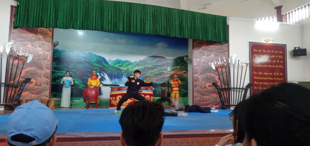 Đến Tây Sơn – cái nôi của võ cổ truyền, chúng em được chiêm ngưỡng những màn nhạc võ cổ truyền vô cùng đặc sắc bao gồm song đao, roi (côn), thương (giáo),.. và những tiếng trống, tiếng kèn hào hùng. Một bài trống trận Tây Sơn gồm 3 hồi; xuất trận, xung trận – công thành, ca khúc khải hoàn và điều đặc biệt nhất là không hề có hồi thu quân như trống trận các triều đại khác. Quân Tây Sơn nổi tiếng với tinh thần chiến đấu bất khuất, dứt khoát, mỗi trận đều bách chiến bách thắng. Không có “hồi thu quân” là thể hiện niềm tin chiến thắng tuyệt đối, không để lại ý niệm “rút lui” hay “thất bại”. Thưởng thức màn trống trận hôm nay, chúng em ngày càng nuôi lòng yêu nước trong lòng mình để viết tiếp bản hùng ca dân tộc.
