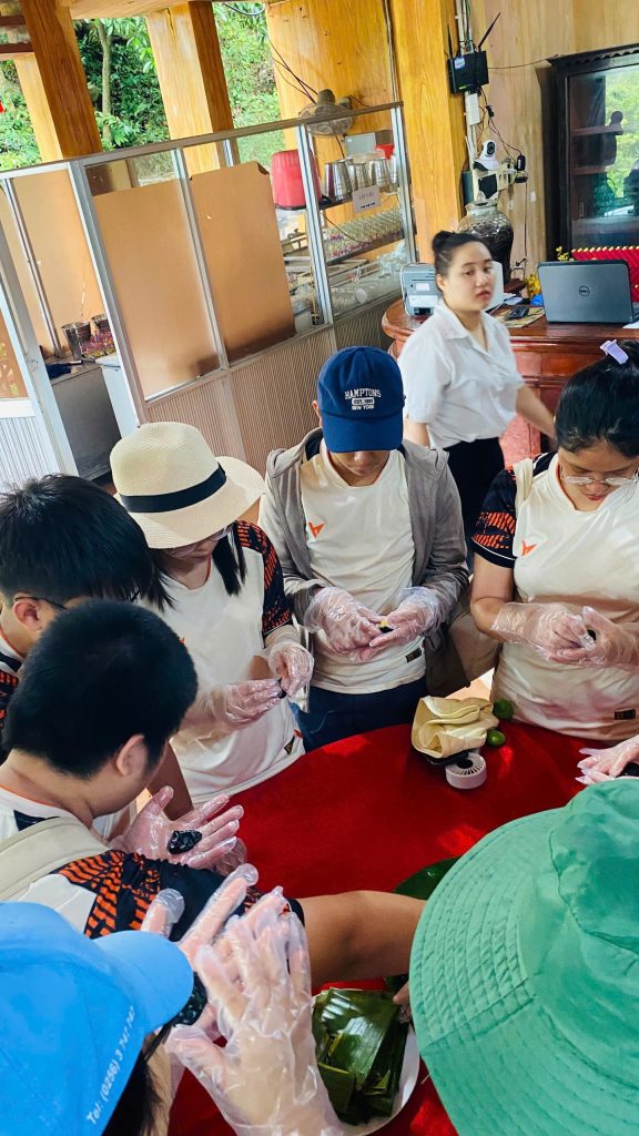 Sau khi tham quan Bảo tàng Quang Trung, chúng em được ghé thăm khu du lịch sinh thái Hầm Hô, một bức tranh sơn thủy hữu tình, không gian rộng lớn bao la, phủ đầy sắc xanh tươi mát của rừng cây và sông nước với thời tiết khá mát mẻ và mưa nhẹ nên nhìn thấy được quang cảnh vô cùng thoáng đãng của Hầm Hô với nhiều loại cây cổ thụ và các hòn, các đá, các hang như Bãi đá cuội, Đá Bàn Cờ, Hang dơi,.. Nhờ không gian mát mẻ này, chúng em được trải nghiệm bắt cá, ngắm cừu, ngắm gà,.. và được tự tay ép nhân, gói bánh ít lá gai – một món ăn đặc sản của Bình Định.