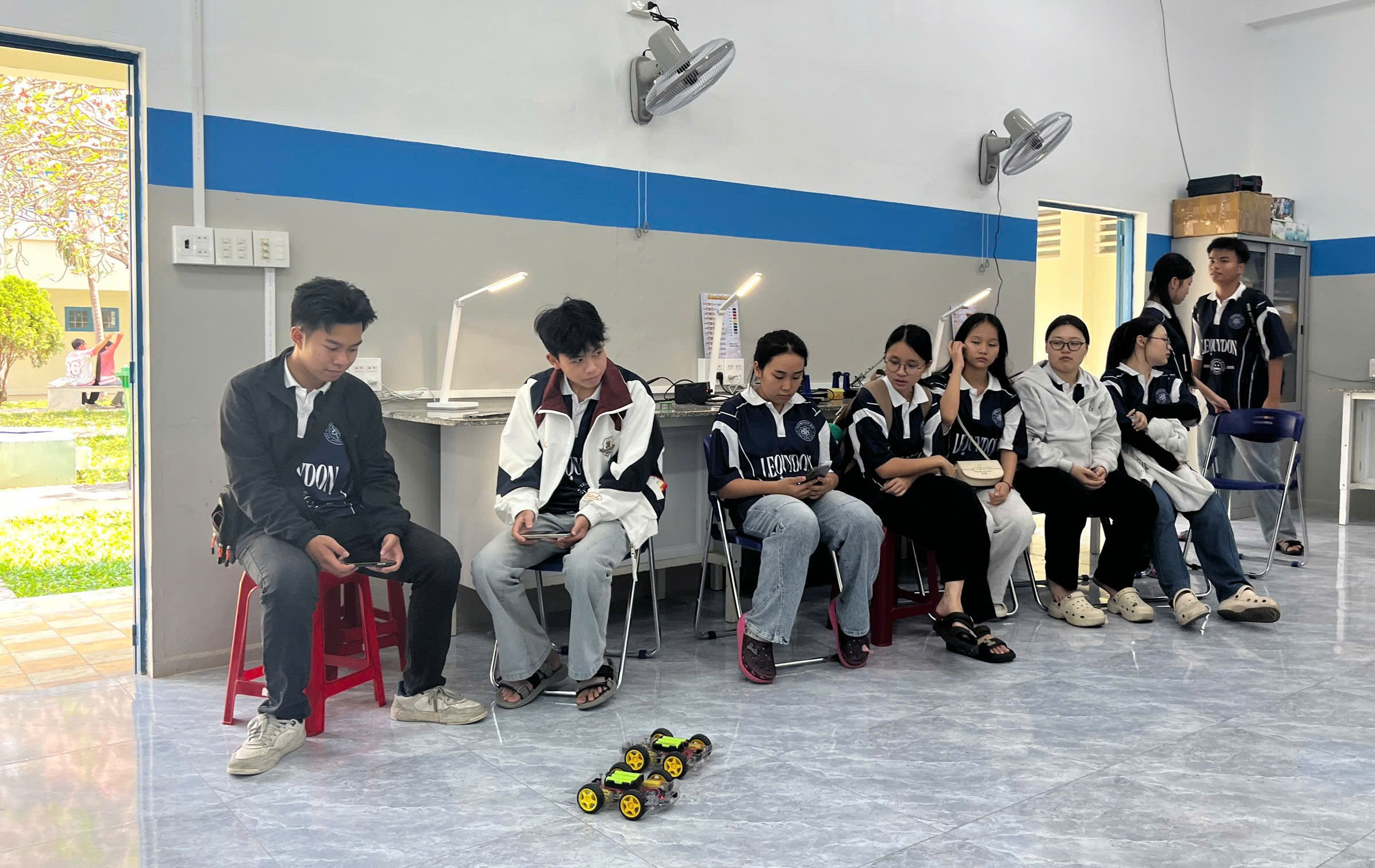 Sau khi rời khỏi trạm đầu tiên là khu xưởng ô tô với những âm thanh máy móc rộn ràng và mùi dầu đặc trưng, lớp 10 Hóa tiếp tục hành trình đến trạm thứ hai – phòng studio của trường Đại học Quy Nhơn. Nếu ở xưởng ô tô mang đến cảm giác mạnh mẽ, thực tế của ngành kỹ thuật, thì studio lại mở ra một không gian hoàn toàn khác: hiện đại, sáng tạo và đầy tính nghệ thuật.