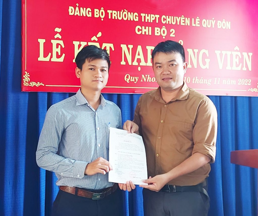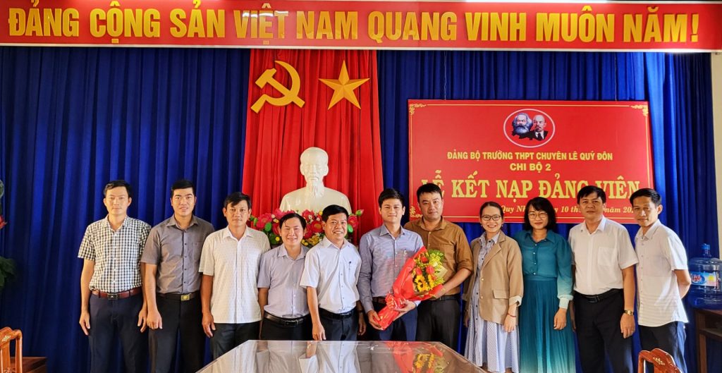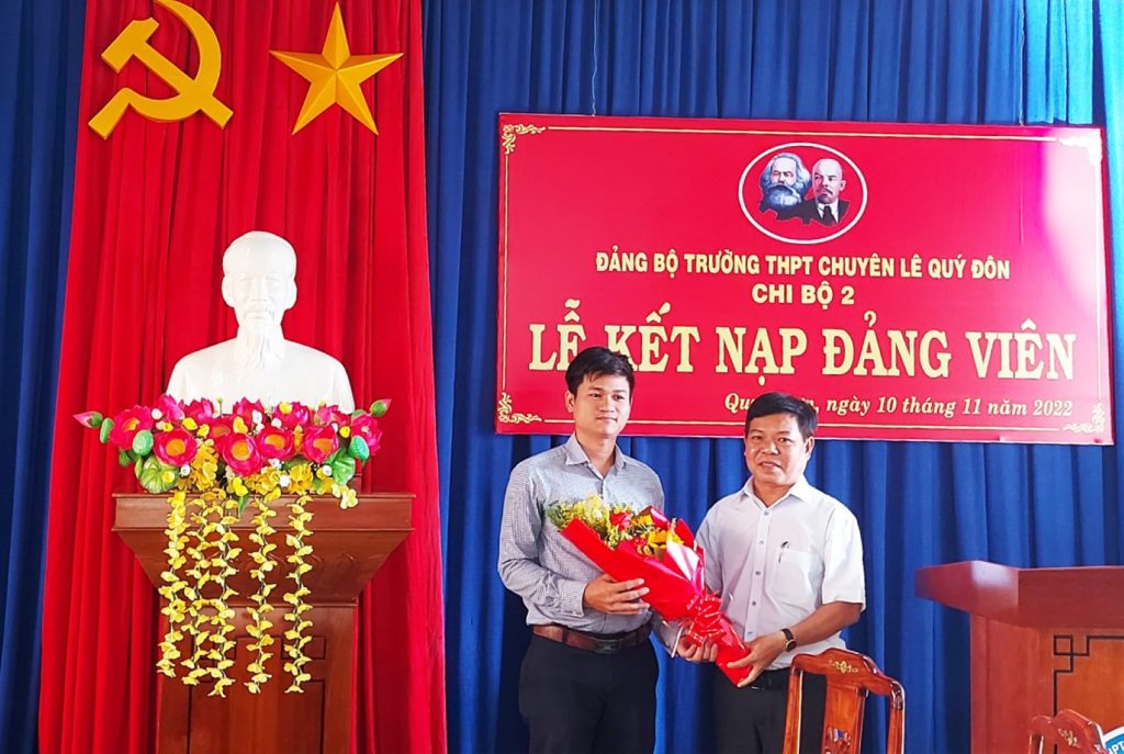 Căn cứ vào Điều lệ Đảng Cộng sản Việt Nam và xét đơn xin vào đảng của quần chúng ưu tú Lê Như Thương, chiều ngày 10 tháng 11 năm 2022 Chi bộ 2 thuộc Đảng bộ trường THPT Chuyên Lê Quý Đôn đã tổ chức Lễ kết nạp cho quần chúng ưu tú Lê Như Thương, Giáo viên môn Tin học vào Đảng Cộng sản Việt Nam.