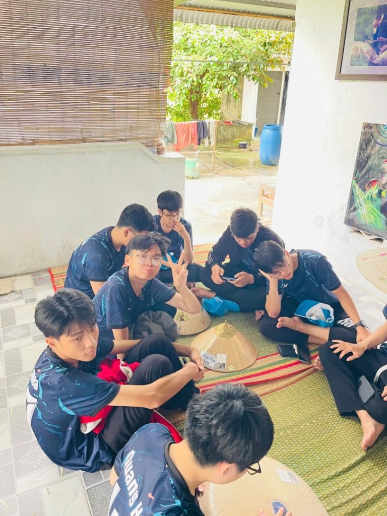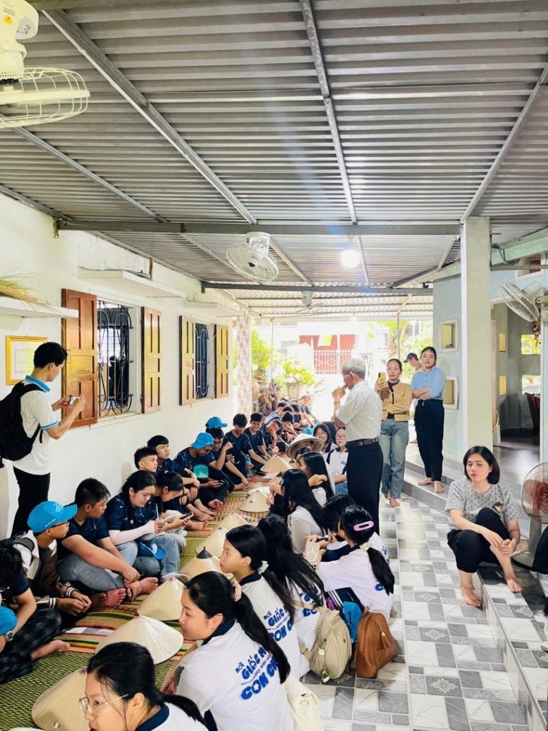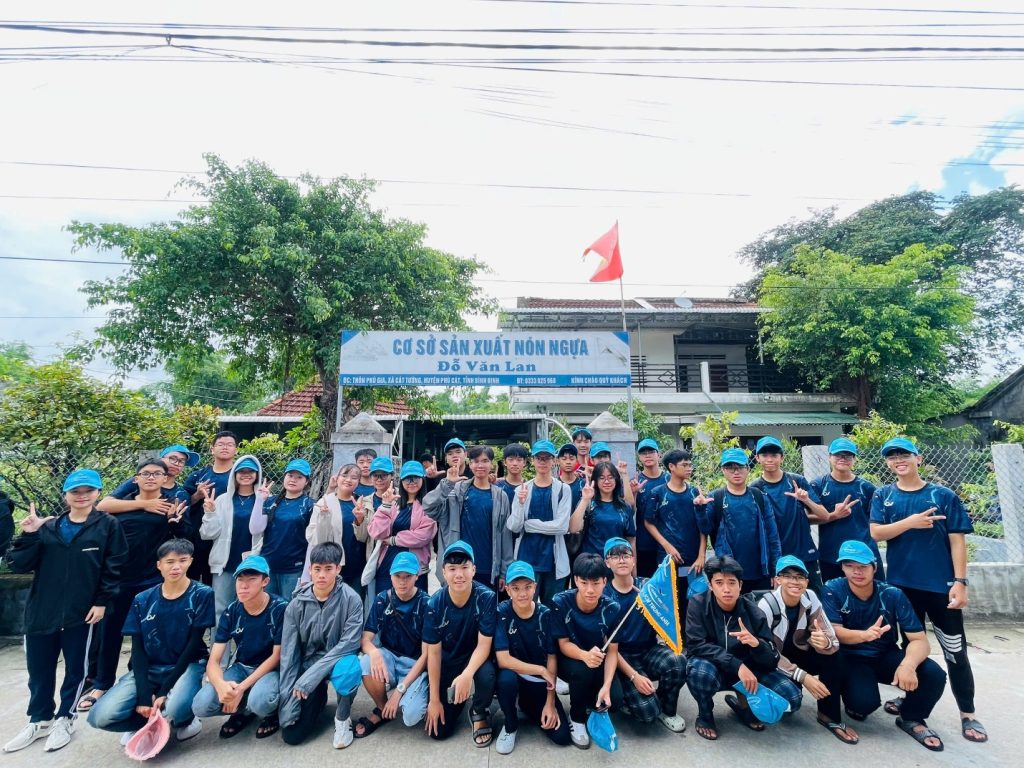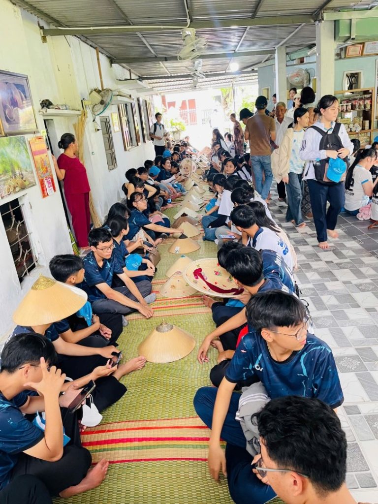 Rời chốn tâm linh thanh tịnh, chuyến xe mang số hiệu LK27 tiếp tục hành trình trải nghiệm thực tế tại làng nghề truyền thống nón ngựa Phú Gia – một trong những biểu tượng văn hóa độc đáo của vùng đất Bình Định(nay là Gia Lai). Trái ngược với không gian hùng vĩ nơi núi cao biển rộng, làng nón ngựa Phú Gia hiện ra bình dị, mộc mạc với nhịp sống chậm rãi và những mái nhà đơn sơ nằm nép mình bên triền núi.Tại đây, chúng em được tận mắt chứng kiến quy trình làm nón – từ việc chẻ tre, chuốt vành, phơi lá đến công đoạn khâu từng chiếc nón bằng tay. Dưới bàn tay khéo léo của các cô, các bác nghệ nhân, những chiếc nón ngựa trắng tinh hiện lên không chỉ là vật dụng quen thuộc mà còn là kết tinh của sự tỉ mỉ, kiên nhẫn và lòng yêu nghề được gìn giữ qua nhiều thế hệ.