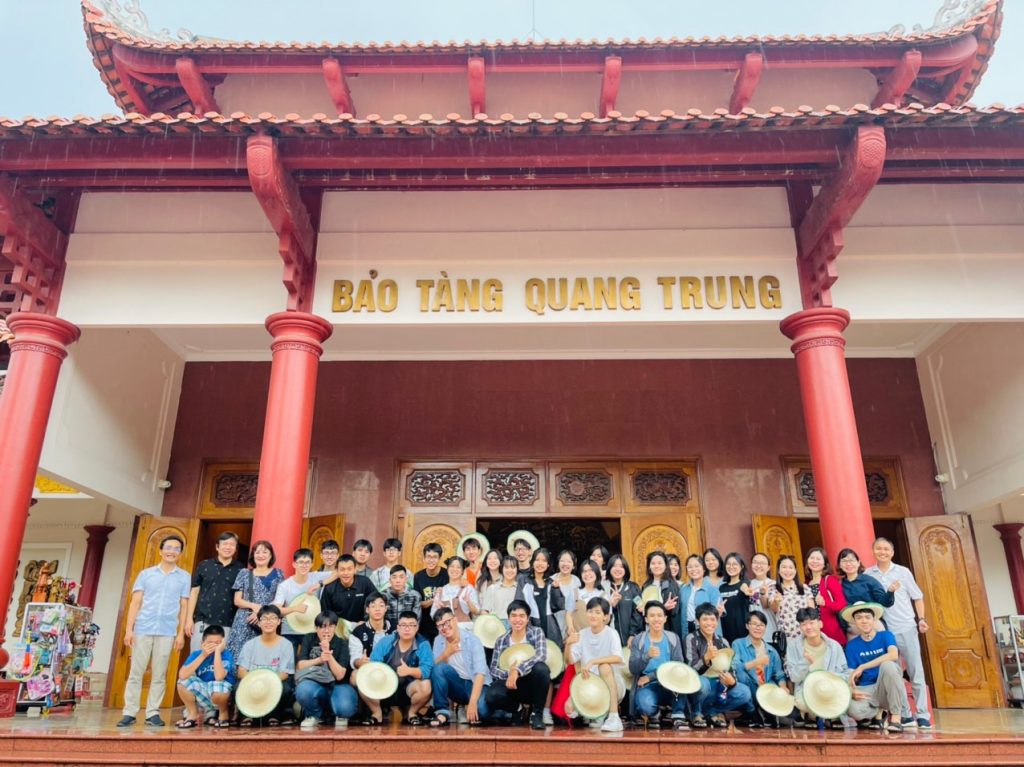 Thoạt nhìn đầu tiên, chúng em cảm nhận được bảo tàng được thiết kế với bố cục cân đối, tỏa tròn ra tứ hướng và tụm lại vào điểm chính giữa – nơi đặt tượng đài Quang trung – Nguyễn Huệ. Từ xa trông vào ta thấy bao quanh bảo tàng Quang Trung Bình Định là “khí chất” cổ xưa với những lớp mái ngói đỏ gạch, cong cong chạm khắc những hình uốn lượn điêu nghệ.
