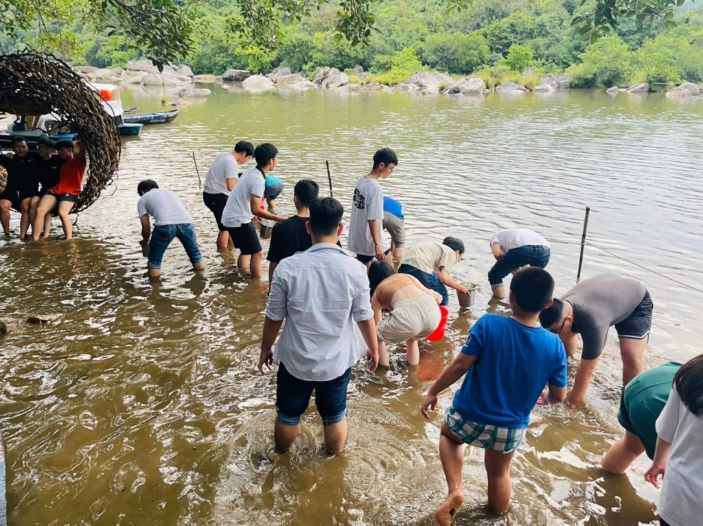 Sau khi bước vào giữa màu xanh bạt ngàn của rừng xanh dưới chân dãy Trường Sơn, chúng em bất ngờ trước tuyệt tác thiên nhiên Hầm Hô – một sự kết hợp hài hòa của khúc sông Trời Lấp, với Hòn Chuông, Hòn Bóng, với Đá Thành, và Bàn Cờ Tiên, tạo nên một khung cảnh tựa chốn bồng lai tiên cảnh.