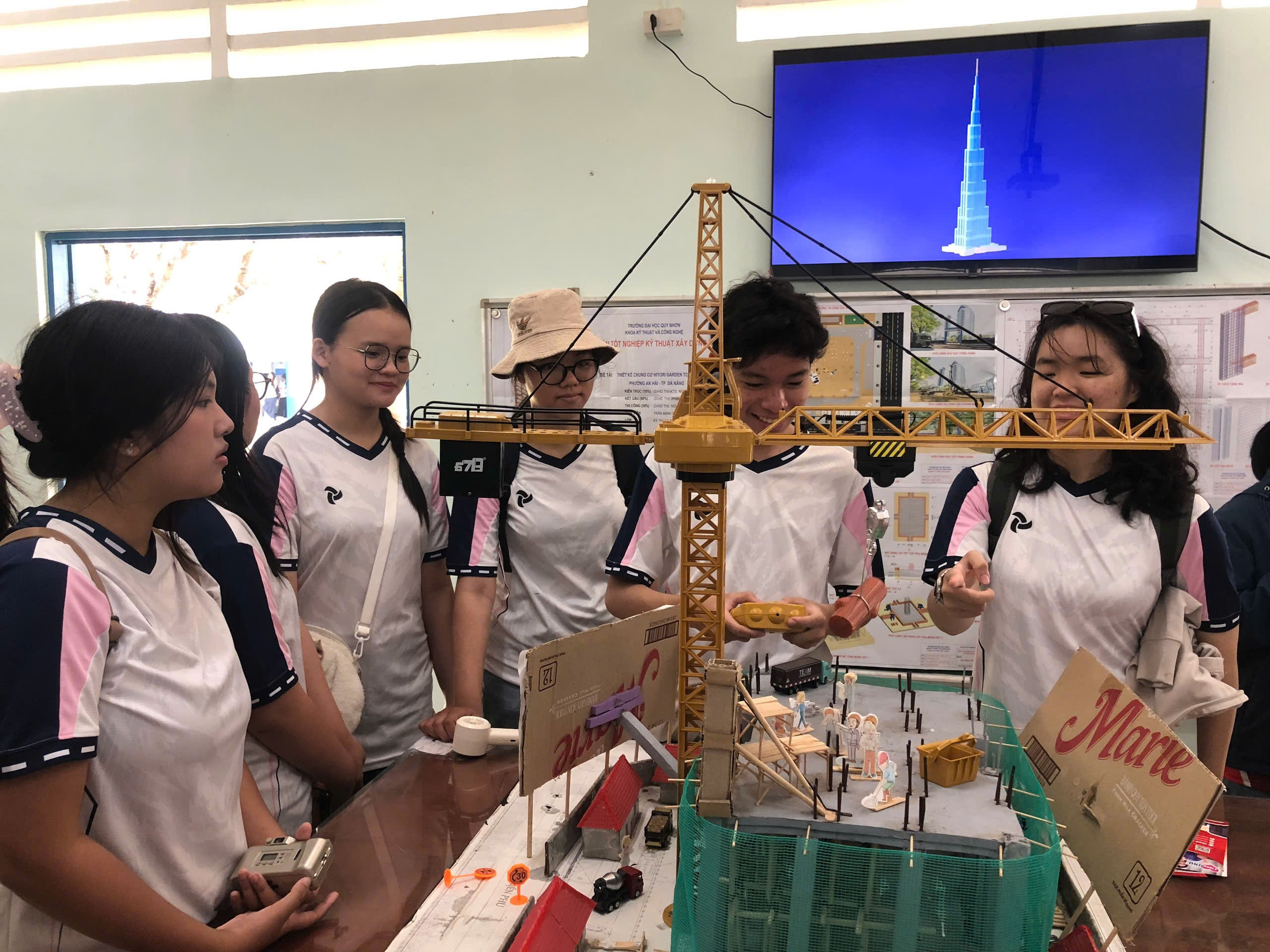 Một điểm đến khác cũng để lại nhiều ấn tượng trong chúng em là khu vực trưng bày và thực hành của các ngành thuộc lĩnh vực kiến trúc, xây dựng. Những mô hình, bản vẽ và sản phẩm học tập ở đây khiến chúng em thật sự khâm phục sự tỉ mỉ, óc sáng tạo và công sức mà thầy cô, sinh viên đã bỏ ra. Qua lời chia sẻ của các thầy cô, chúng em hiểu thêm rằng để theo đuổi một ngành nghề, không chỉ cần đam mê mà còn cần sự kiên trì, tinh thần học hỏi và khả năng thích nghi với yêu cầu ngày càng cao của xã hội.