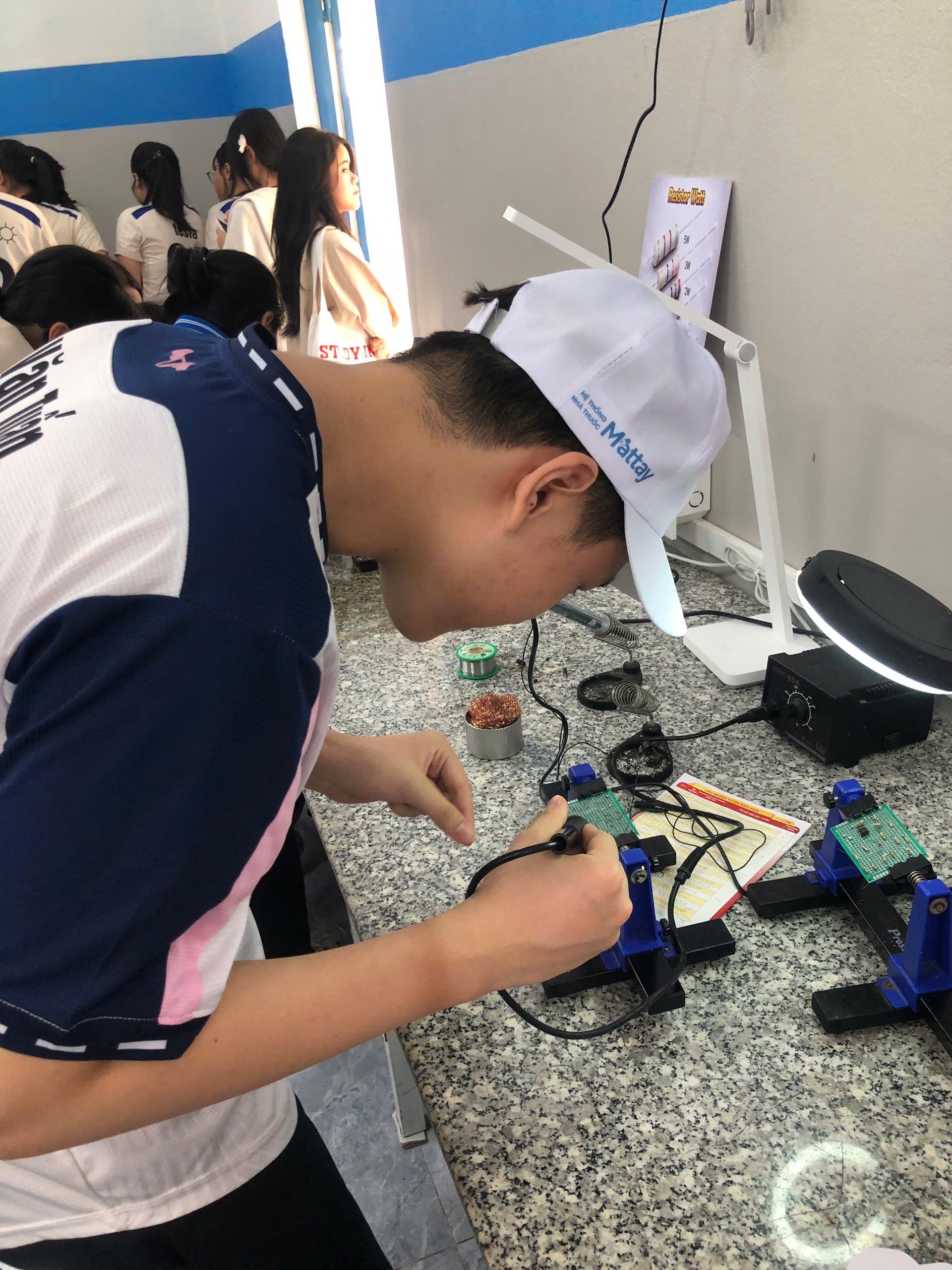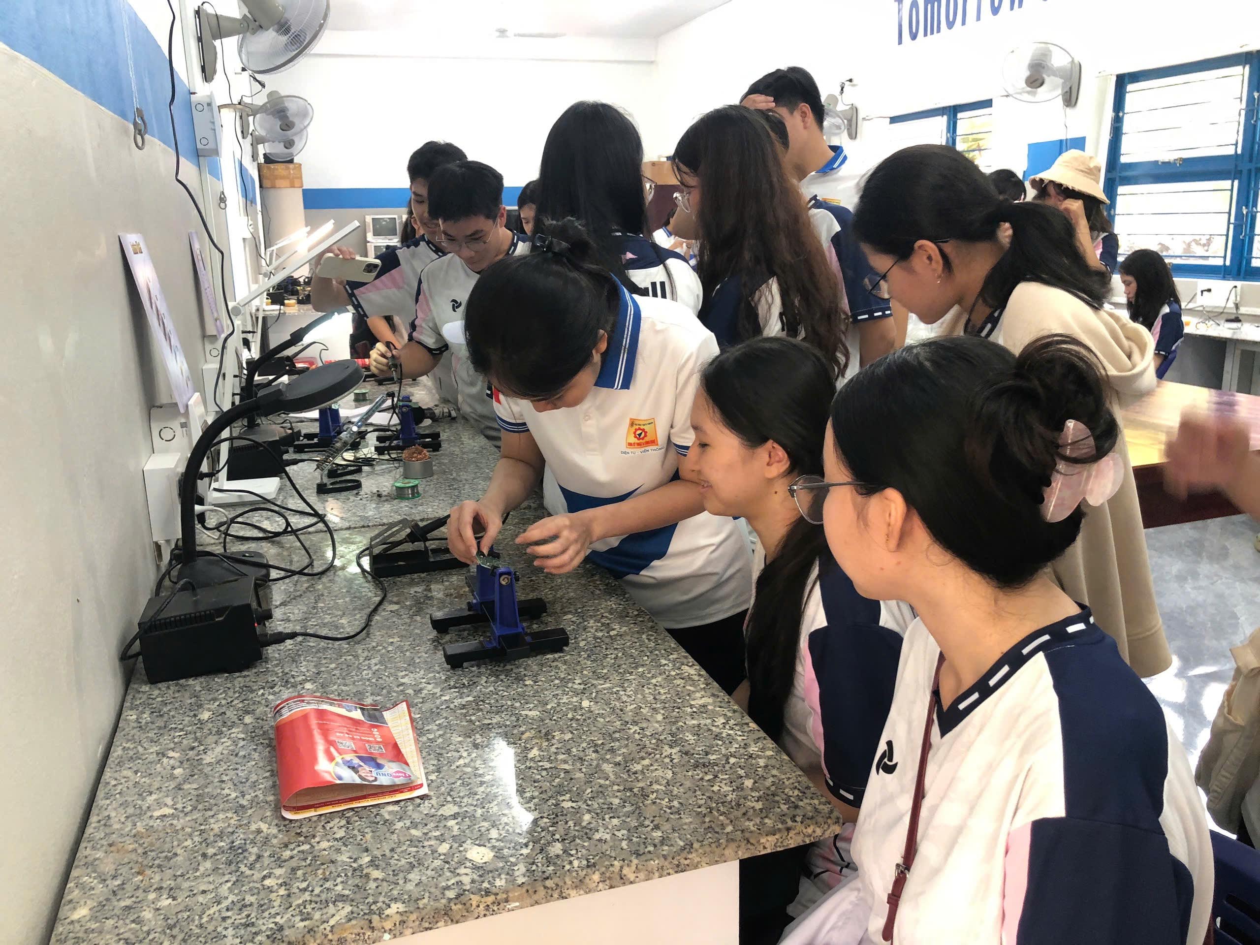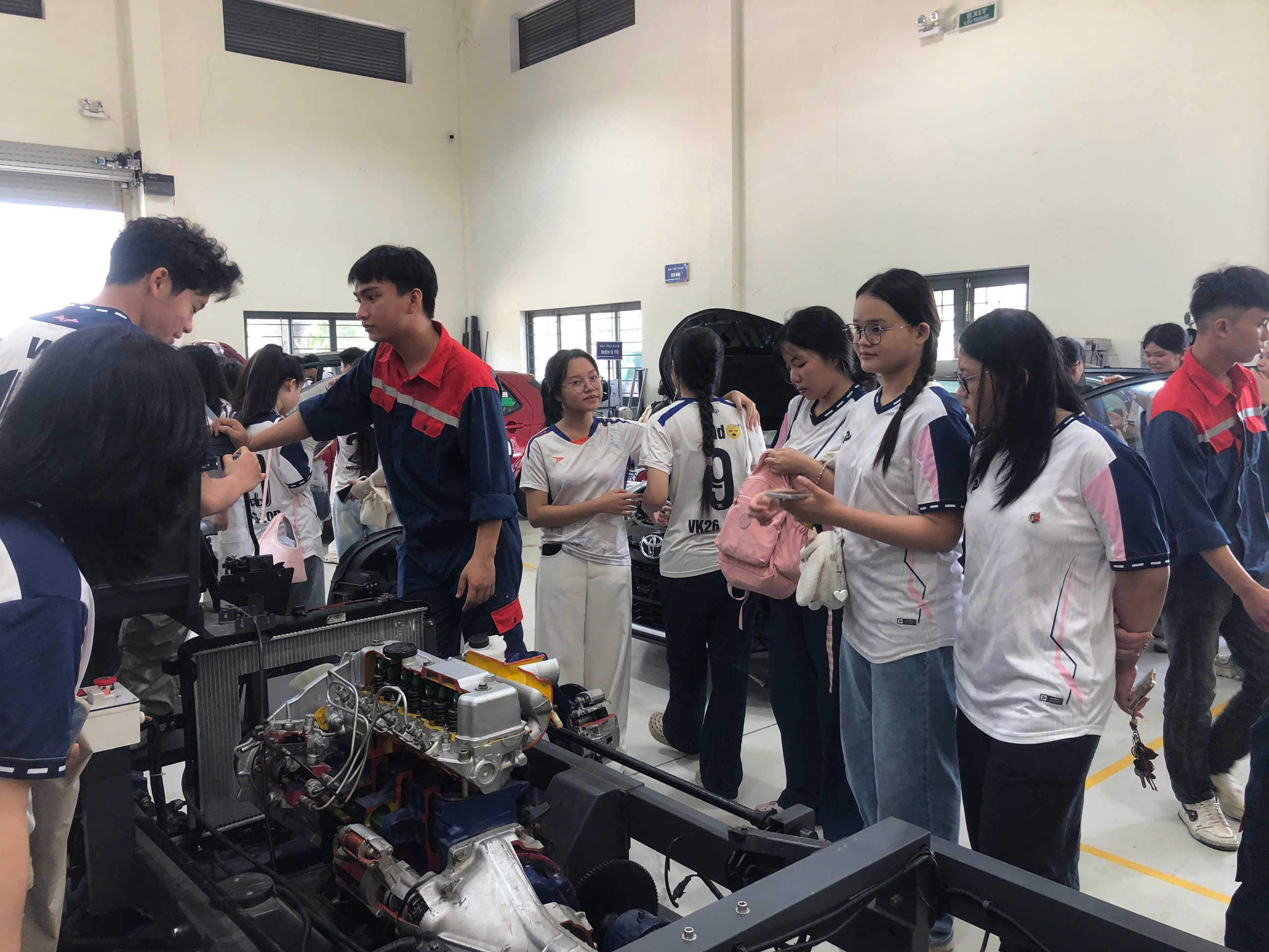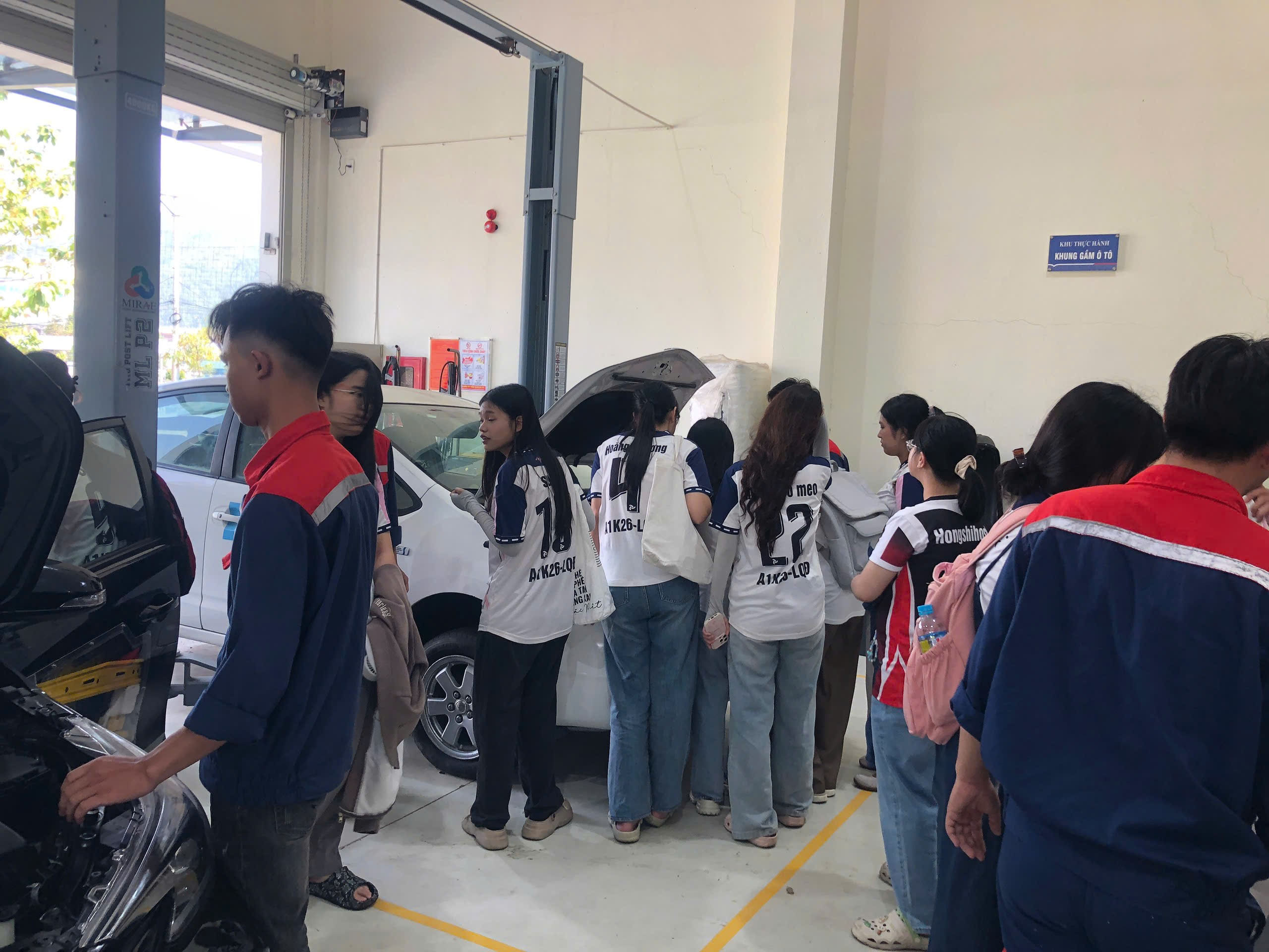 Rời studio, chúng em tiếp tục đến tham quan khu vực thực hành của Khoa Ô tô. Nếu studio mang đến cảm giác sáng tạo và sôi động thì nơi đây lại gây ấn tượng bởi sự chính xác, hiện đại và tính ứng dụng cao. Chúng em được quan sát các mô hình động cơ, gầm xe, hệ thống điện và nghe giới thiệu về quá trình đào tạo trong nhóm ngành kỹ thuật. Dù là học sinh lớp chuyên Anh, chúng em vẫn cảm thấy vô cùng cuốn hút trước sự kết hợp giữa kỹ thuật, công nghệ và tư duy sáng tạo. Chuyến tham quan đã giúp chúng em hiểu rằng mỗi ngành nghề đều có giá trị riêng, và chỉ khi được tận mắt chứng kiến, chúng em mới cảm nhận rõ hơn sự đa dạng của thế giới nghề nghiệp.