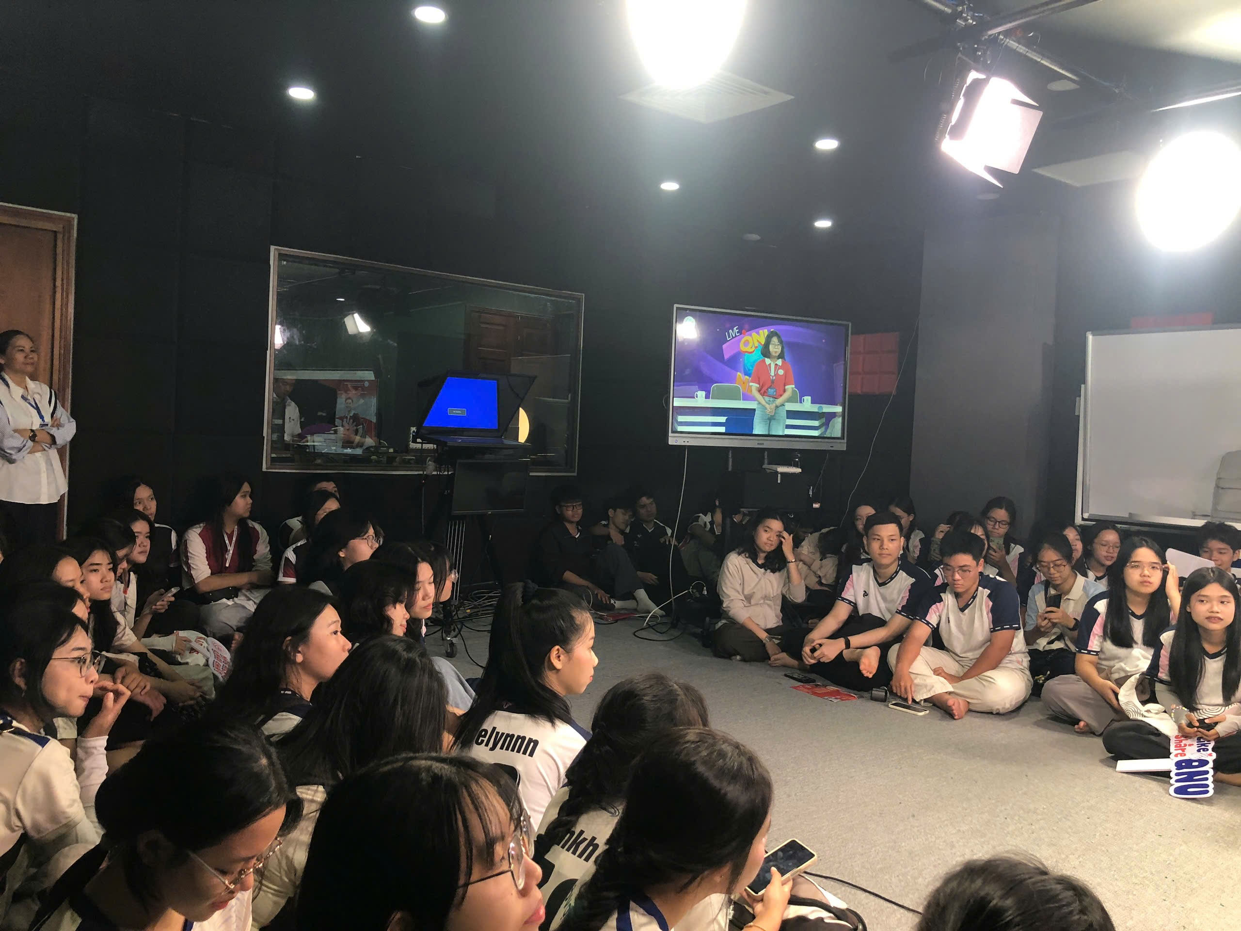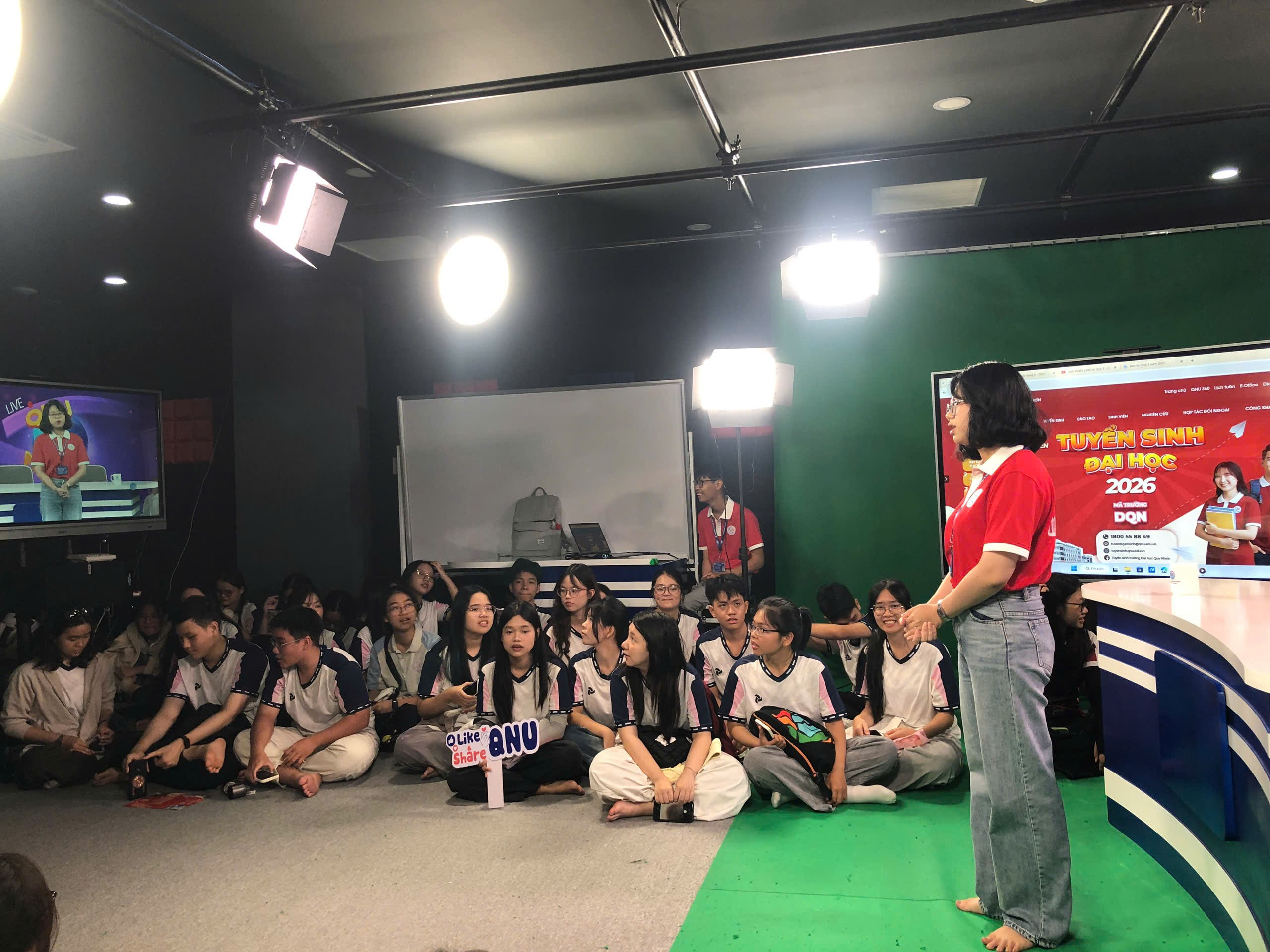Ngay từ khi đặt chân đến Trường Đại học Quy Nhơn, chúng em đã cảm nhận được không khí năng động, hiện đại và đầy cảm hứng học tập. Điểm đến đầu tiên là khu vực studio. Không gian ở đây khiến chúng em rất thích thú bởi sự chuyên nghiệp với phông xanh, hệ thống đèn chiếu, máy quay và màn hình lớn. Nhiều bạn lần đầu tiên được hình dung rõ hơn về công việc của một MC, biên tập viên hay người làm truyền thông. Được trực tiếp quan sát và nghe giới thiệu về môi trường học tập như vậy, chúng em cảm thấy rất mới mẻ, hào hứng và nhận ra rằng có những ngành nghề trước đây mình chưa từng hiểu đầy đủ.